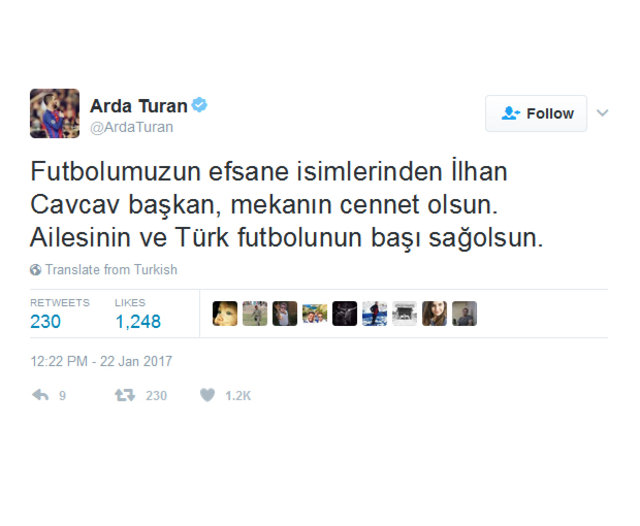 ARDA TURAN: "Futbolumuzun efsane isimlerinden İlhan Cavcav başkan, mekanın cennet olsun. Ailesinin ve Türk futbolunun başı sağolsun."