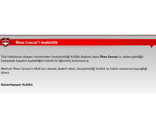 GAZİANTEPSPOR KULÜBÜ: "Türk futbolunun duayen isimlerinden Gençlerbirliği Kulübü Başkanı Sayın İlhan Cavcav'ın, tedavi gördüğü hastanede hayatını kaybettiğini üzüntü ile öğrenmiş bulunuyoruz. Merhum İlhan Cavcav'a Allah'tan rahmet, kederli ailesi, Gençlerbirliği Kulübü ve futbol camiasına başsağlığı dileriz."