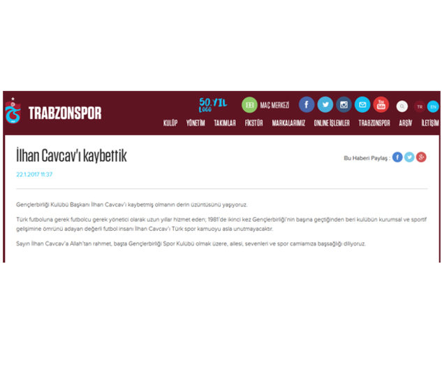 TRABZONSPOR KULÜBÜ: "Gençlerbirliği Kulübü Başkanı İlhan Cavcav’ı kaybetmiş olmanın derin üzüntüsünü yaşıyoruz. Türk futboluna gerek futbolcu gerek yönetici olarak uzun yıllar hizmet eden; 1981’de ikinci kez Gençlerbirliği’nin başına geçtiğinden beri kulübün kurumsal ve sportif gelişimine ömrünü adayan değerli futbol insanı İlhan Cavcav’ı Türk spor kamuoyu asla unutmayacaktır. Sayın İlhan Cavcav’a Allah’tan rahmet, başta Gençlerbirliği Spor Kulübü olmak üzere, ailesi, sevenleri ve spor camiamıza başsağlığı diliyoruz."