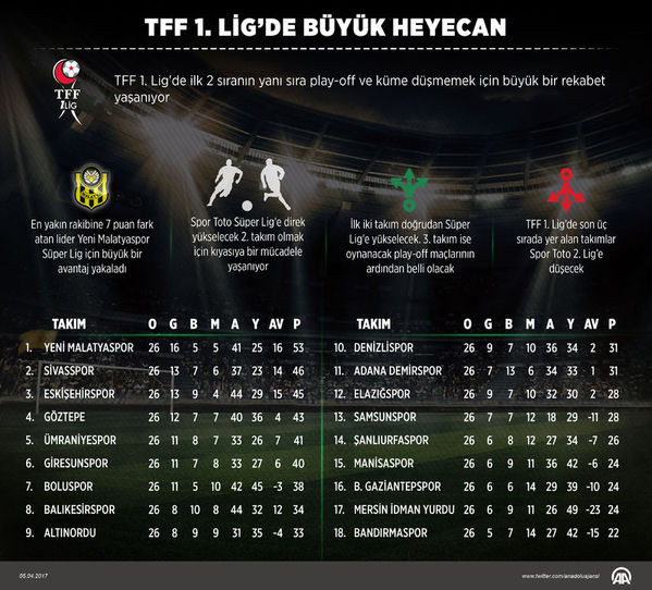 Süper Lig'e yükselmek için son durak olan lig, son yılların en heyecanlı yarışına sahne oluyor. 53 puanla lider durumda bulunan ve en yakın takipçisi Sivasspor'a 7 puan fark atan Evkur Yeni Malatyaspor dışındaki takımlar için kalan haftalar daha zorlu geçecek.
