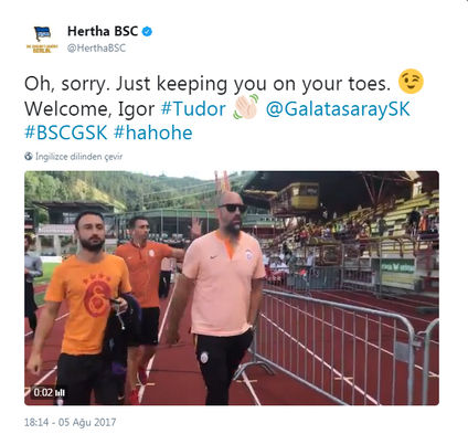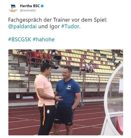 Kulübün Twitter hesabından atılan bir Tweet'te Galatasaray kaleci antrenörü Sandro Tomic'in Hertha Berlin Teknik Direktörü Paul Dardai ile sohbet ettiği görüldü. Ancak etiket kısma Igor Tudor'un adı yazıldı.