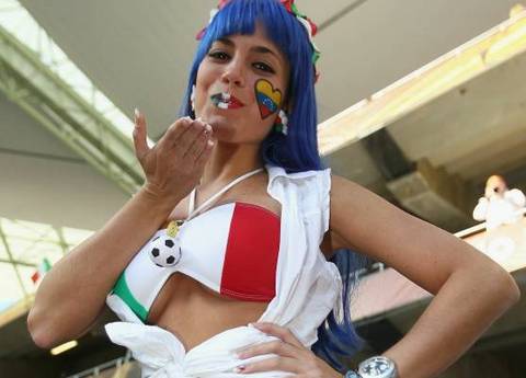 İtalya-Yeni Zelanda maçında tribünlerdeki yerini alan bu hanımefendi, başarılı kıyafet tercihi ve ülkesinin bayrağını gururla taşımasıyla beğeni kazandı. Çevresindekilerin şaşkın bakışlarına aldırmadan sürekli etrafa öpücükler dağıtan İtalyan güzeli başta foto muhabirleri olmak üzere tüm taraftarların ilgisini çekti.