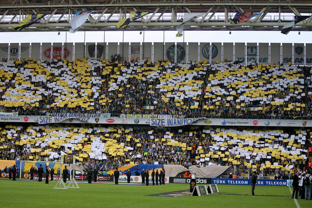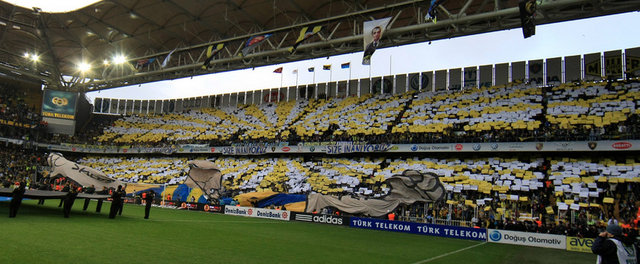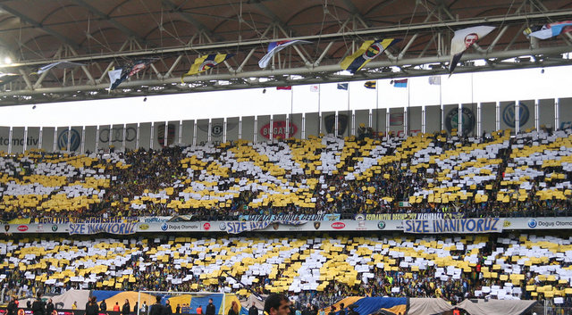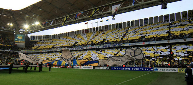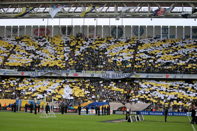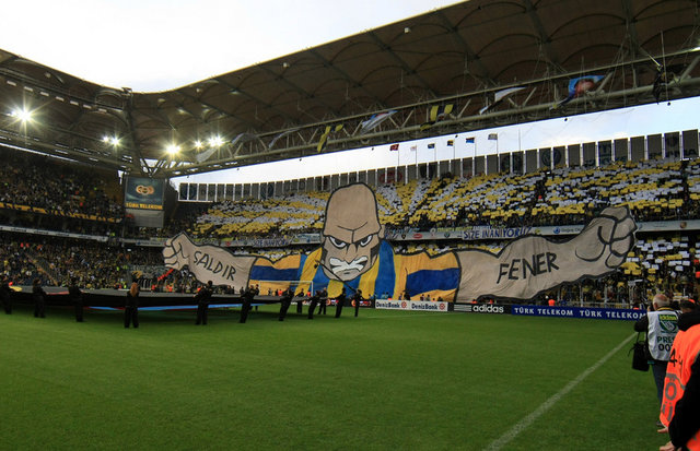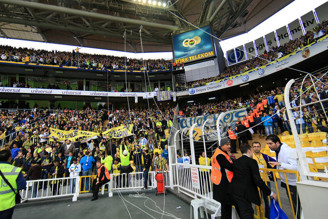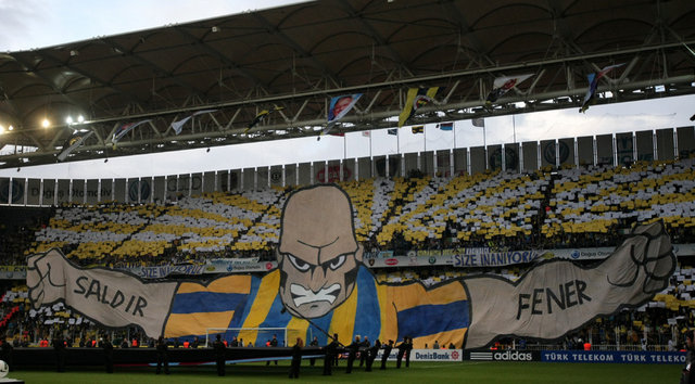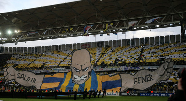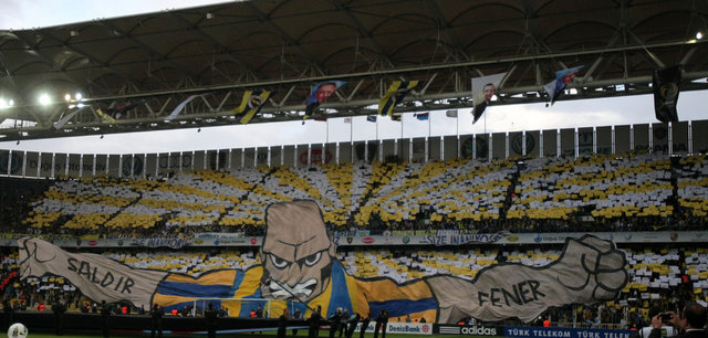 Şükrü Saracoğlu Stadı’nda üzüntü verici kaza... Fenerbahçeli taraftarların Türk Telekom kale arkası tribünde hazırladıkları koreografi, ipleri koptuğu için çok kısa bir süre görülebildi. Tribünde sarı ve beyaz renklerde kartonlar açılarak arka fon oluşturulurken, iplerle yukarıya doğru çekilen perdede bir dev figürü ve kollarında “Saldır Fener” yazısı yer aldı.