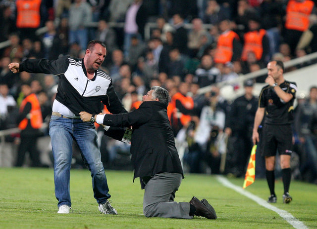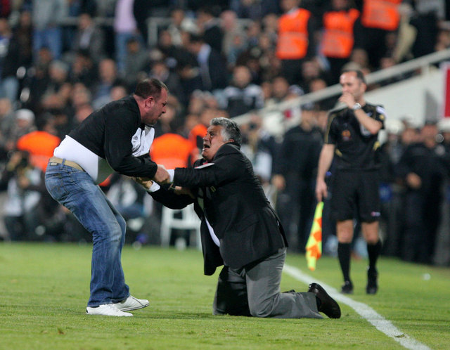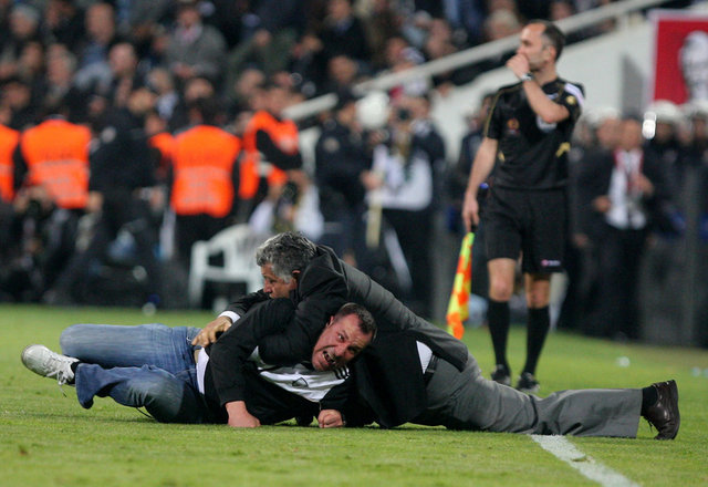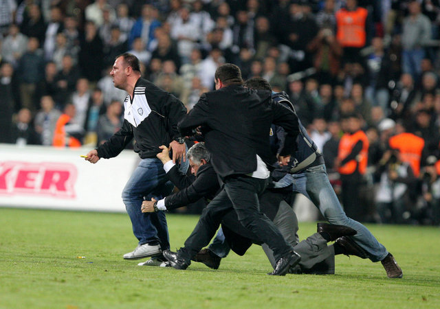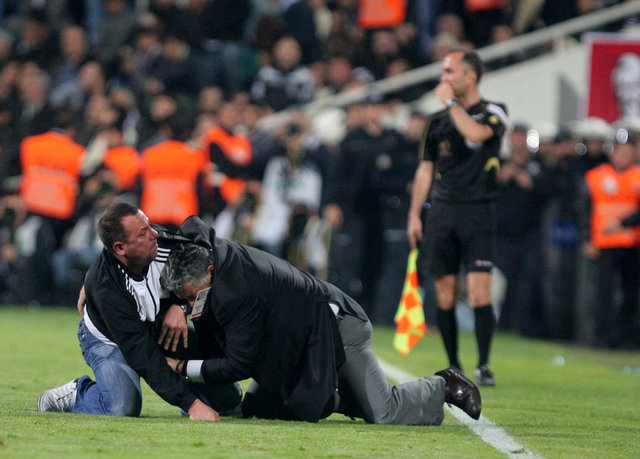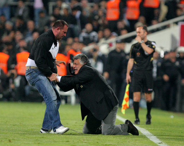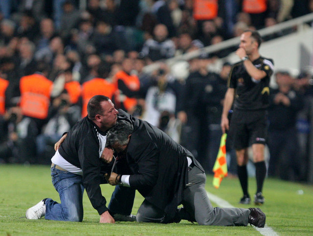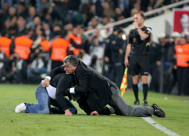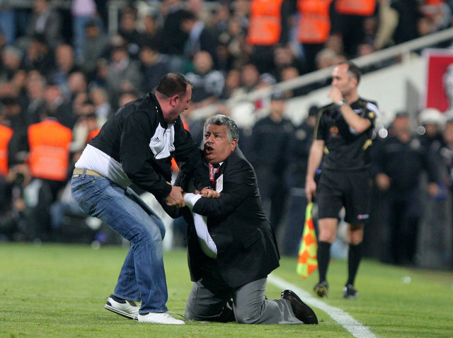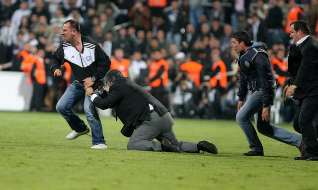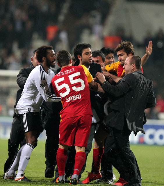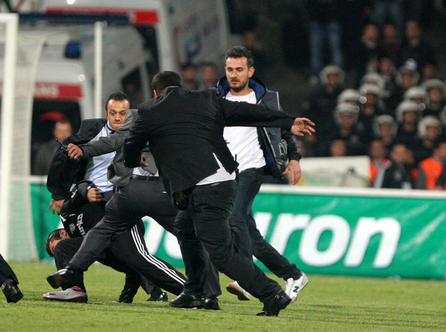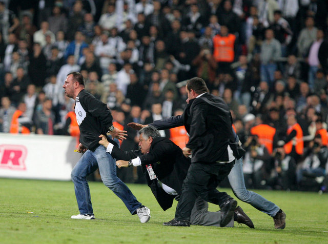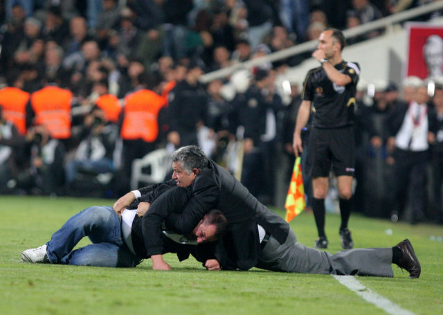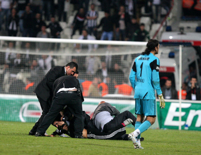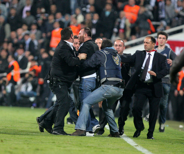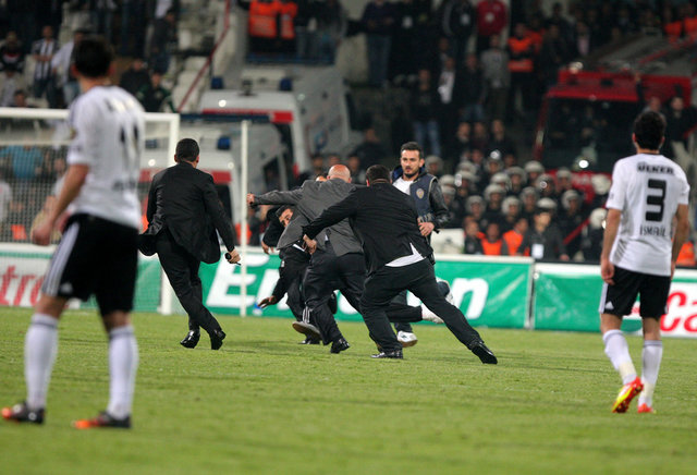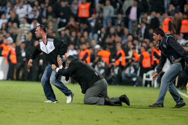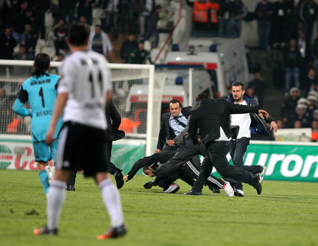Acı görüntülerden birisi de stat görevlisi ile taraftar arasında yaşanan olaydı... Protokol tribününün önünden birisi sahaya girdi, stat görevlisi taraftarın bacağına sarıldı. Buna rağmen hakeme yönelik söylemlerde bulunan taraftar saldırıda kararlıydı! Ancak görevli de saldırganı bırakmamaya niyetliydi ve başarılı da oldu. Diğer görevlilerin müdahalesiyle taraftar gözaltına alındı. Maçın son anlarında Eboue’nin taç atışı sırasında önce yabancı madde yağdı. G.Saraylı oyuncu sahaya doğru hareketlenirken bir taraftar üzerine saldırdı. Ancak araya futbolcular girdi ve yere düştü. Sonrasında bir taraftar daha sahaya girdi. Bu sırada yaklaşık 5 dakika duran maç tekrar başladı ve 1.5 dakika sonra bitti.