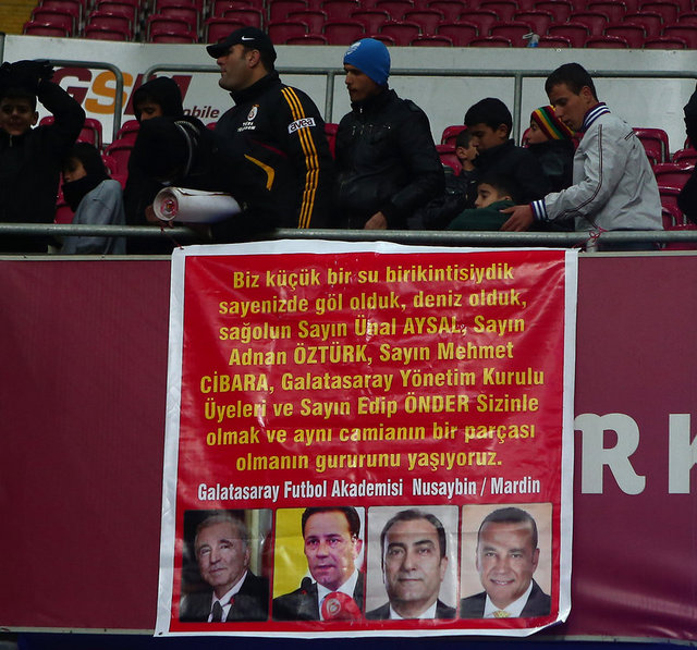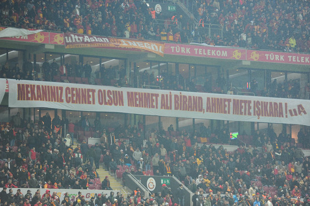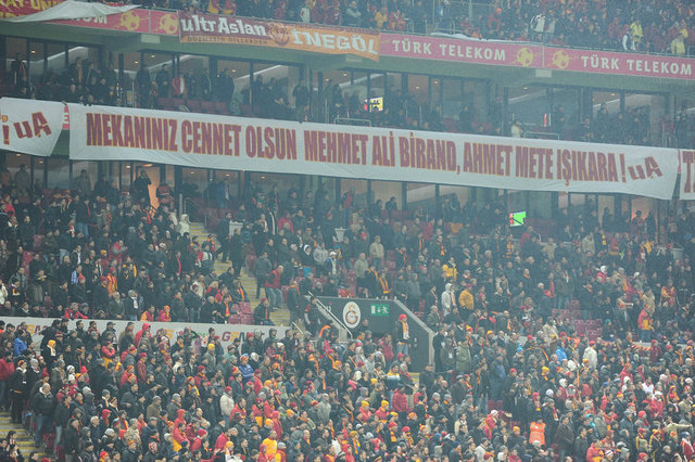 Galatasaray taraftarları, derbi maçta Türk Telekom Arena'yı pankartlarla donatarak çeşitli mesajlar verdiler. Vefat eden ve Galatasaraylılığı ile bilinen gazeteci-yazar Mehmet Ali Birand ile deprem çalışmalarıyla ön plana çıkan Prof. Dr. Ahmet Mete Işıkara için, ''Mekanınız cennet olsun Mehmet Ali Birand ve Ahmet Mete Işıkara'' pankartları açıldı. Çıkan yangınla önemli hasara uğrayan Galatasaray Üniversitesi binasıyla ilgili, ''Kenetlenerek geçer bu yangının izi. Gururumuzsun Galatasaray Üniversitesi'' pankartı yer aldı.