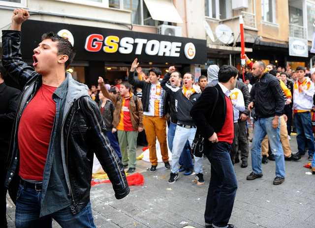 Genç futbolcunun mağazaya gelmesinden sonra Göztepeli olduğu anlaşılan taraftan grubu, GS Store önünde bekleyen Galatasaraylı taraftarlara yumurta, cam şişe ve şemsiye attı.
