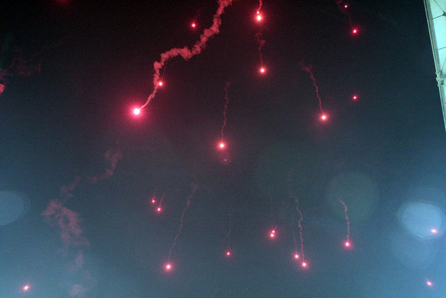 Karşılaşmanın ikinci yarısı oynanırken 54. dakikada stat dışından havai fişek atıldı. Stat dışından atılan havai fişeklerin ardından küçük paraşütlerle saha içerisine bir anda yanıcı maddeler inmeye başlayınca karşılaşmanın hakemi Gautier maçı durdurdu. Stat içinde duman oluşurken, yanıcı maddenin üzerine düştüğü büyük boyuttaki Türk Bayrağı'nın bir köşesi yanmaya başladı. Stat görevlileri bayrağın yandığı noktaya müdahale ederek küçük çaptaki alevi söndürdü. Maç bir dakikalık duraksamanın ardından tekrar devam etti.
