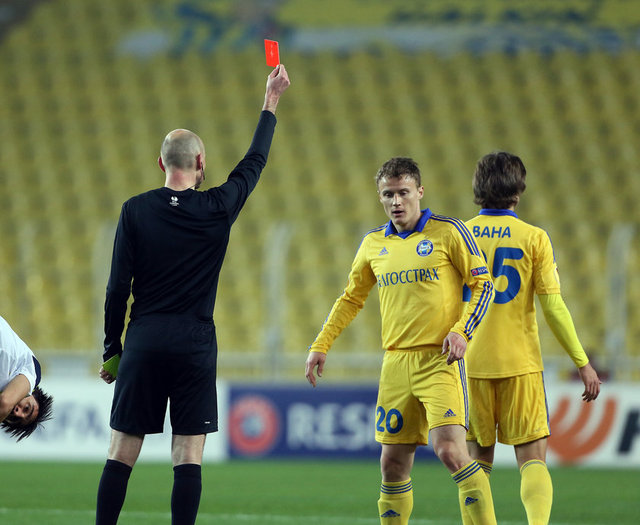 BATE Borisov'da Dmitri Baga 17. ve 20. dakikalarda üst üste gördüğü kartların ardından kırmızı kartla oyundan atılırken, Belarus ekibi bu dakikadan sonra maçta 10 kişi kaldı. İlk kartını Kuyt'a yaptığı faul sonrası alan ikinci kartını da Salih Uçan'a faul yaparak gören Baga, oyun dışında kalarak takımını 20. dakikadan itibaren yalnız bıraktı. İki ekip arasında Belarus'un Grodno kentinde yapılan mücadelede 4. dakikada Fenerbahçe'den Meireles kırmızı kart görmüş ve sarı-lacivertli ekip maça 10 kişi devam etmişti. Belarus ekibinde Baga'nın kırmızı kart görmesinin ardından maçı dev ekrandan izleyen taraftarların sevinci stattan duyuldu.
