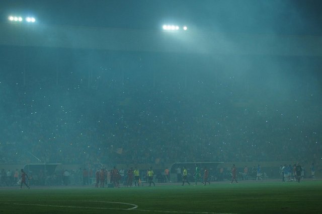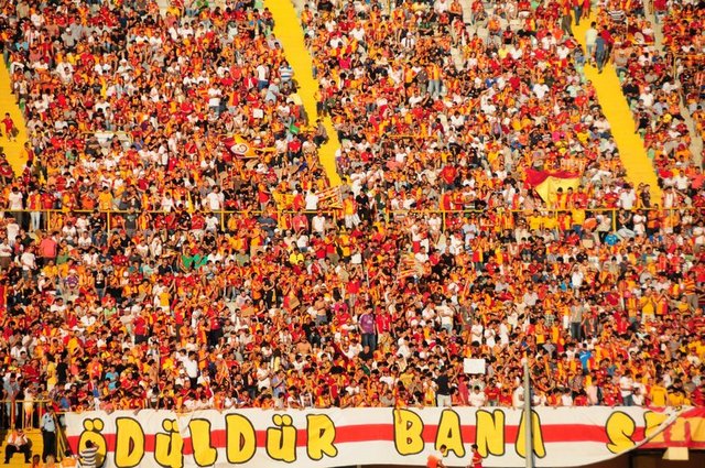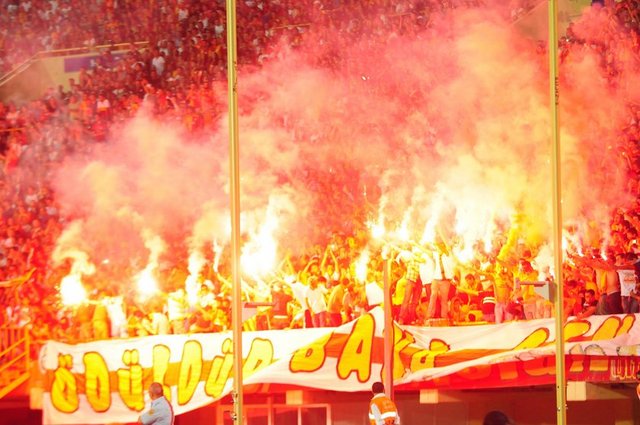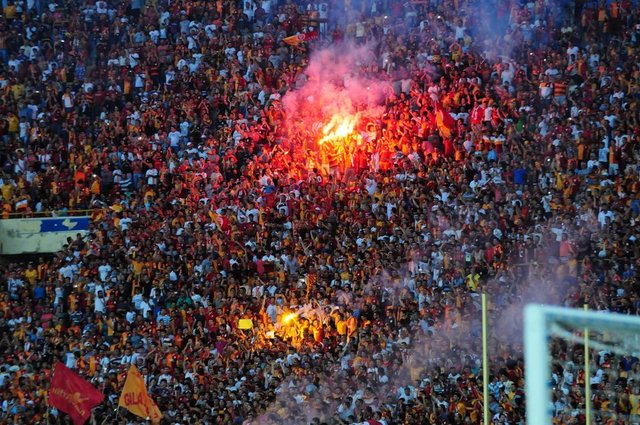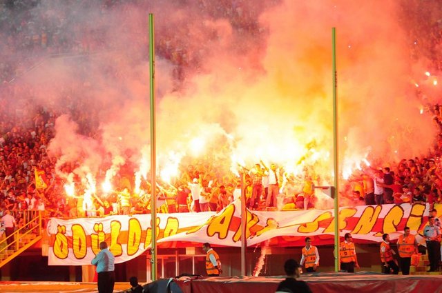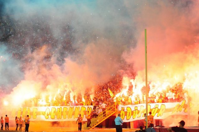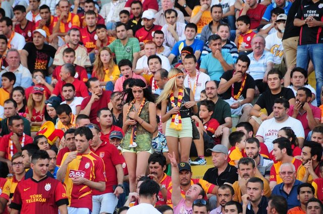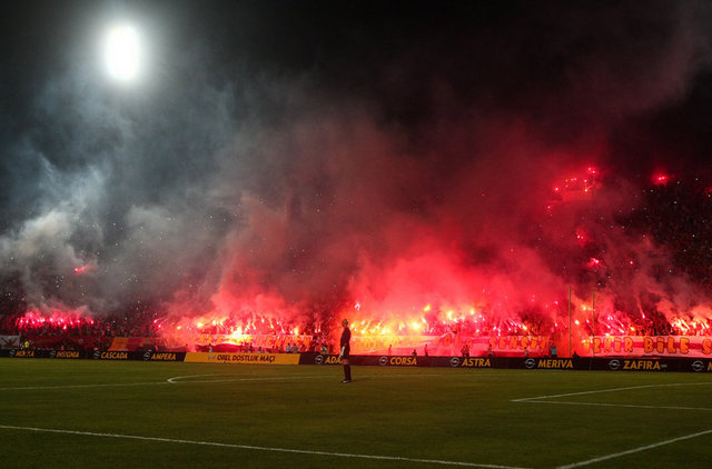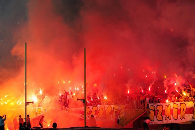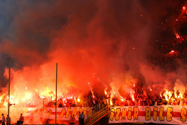 Atatürk Stadı'nda oynanan karşılaşmaya İzmir ve çevresinden gelen sarı kırmızılı taraftarlar yoğun ilgi gösterdi. Açık tribünün tamamen dolduğu müsabakada, kapalı tribünde az sayıda bir boşluk kaldı. Taraftarlar İzmir'in il trafik kodu nedeniyle 35. dakikada meşale yaktılar. Meşale yakımının ardından saha dumanla kaplanırken, hakem de su molası verdi.