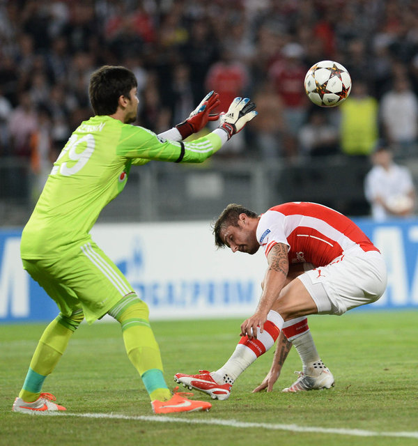 10. dakikada sağ kanattan ceza alanına giren Wilshere, son çizgiye inmeden altıpasta Giroud'u gördü. Bu futbolcu, Ersan'ın müdahalesine rağmen vuruşunu yaparken kaleci Tolga, meşin yuvarlağa sahip oldu.