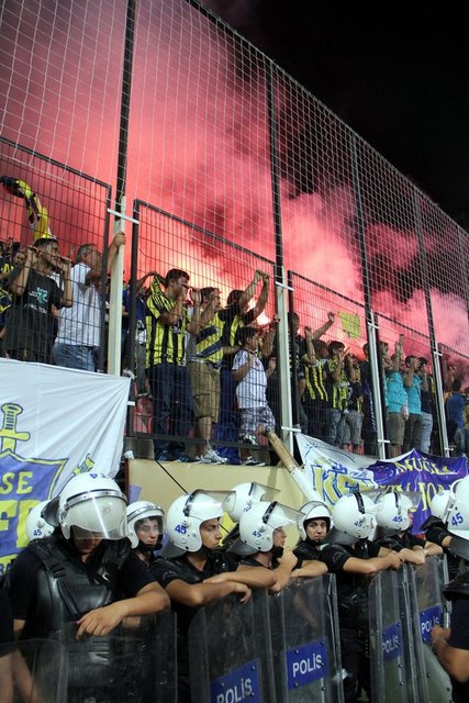 Maç başladıktan sonra bu sefer de Fenerbahçe tribününden Galatasaray kalesine doğru atılan yabancı maddeler nedeniyle maç durdu. Hakem anons yaptırdı. Müsabakanın 82. dakikasında Volkan Demirel'e atılan yabancı maddeler yüzünden hakem Mustafa Kamil Abitoğlu bir kez daha anons yapılmasını istedi.