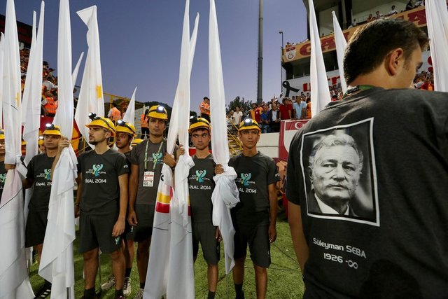 Futbolcular seromoniye Soma'daki maden faciasında hayatını kaybedenlerin çocuklarıyla çıktılar. İstiklal Marşı'nın okunmasının ardından Soma'daki maden faciasında hayatını kaybedenlerin yanı sıra Beşiktaş Kulübü Onursal Başkanı Süleyman Seba, Eski Fenerbahçe Kulübü Başkanı Rıfat Ilgaz ve Eski Galatasaray yöneticisi Turgan Ece için saygı duruşunda bulunuldu. Saygı duruşu sırasında taraftarlar bir ağızdan teşrik tekbiri getirdi.