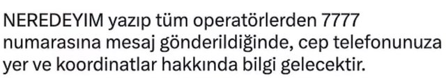 Depremden etkilenen ve an itibarıyla konumunu bulmakta zorlanan vatandaşlar tüm GSM operatörlerinde NEREDEYIM yazıp 7777 numarasına mesaj göndererek konumlarını alabilirler.