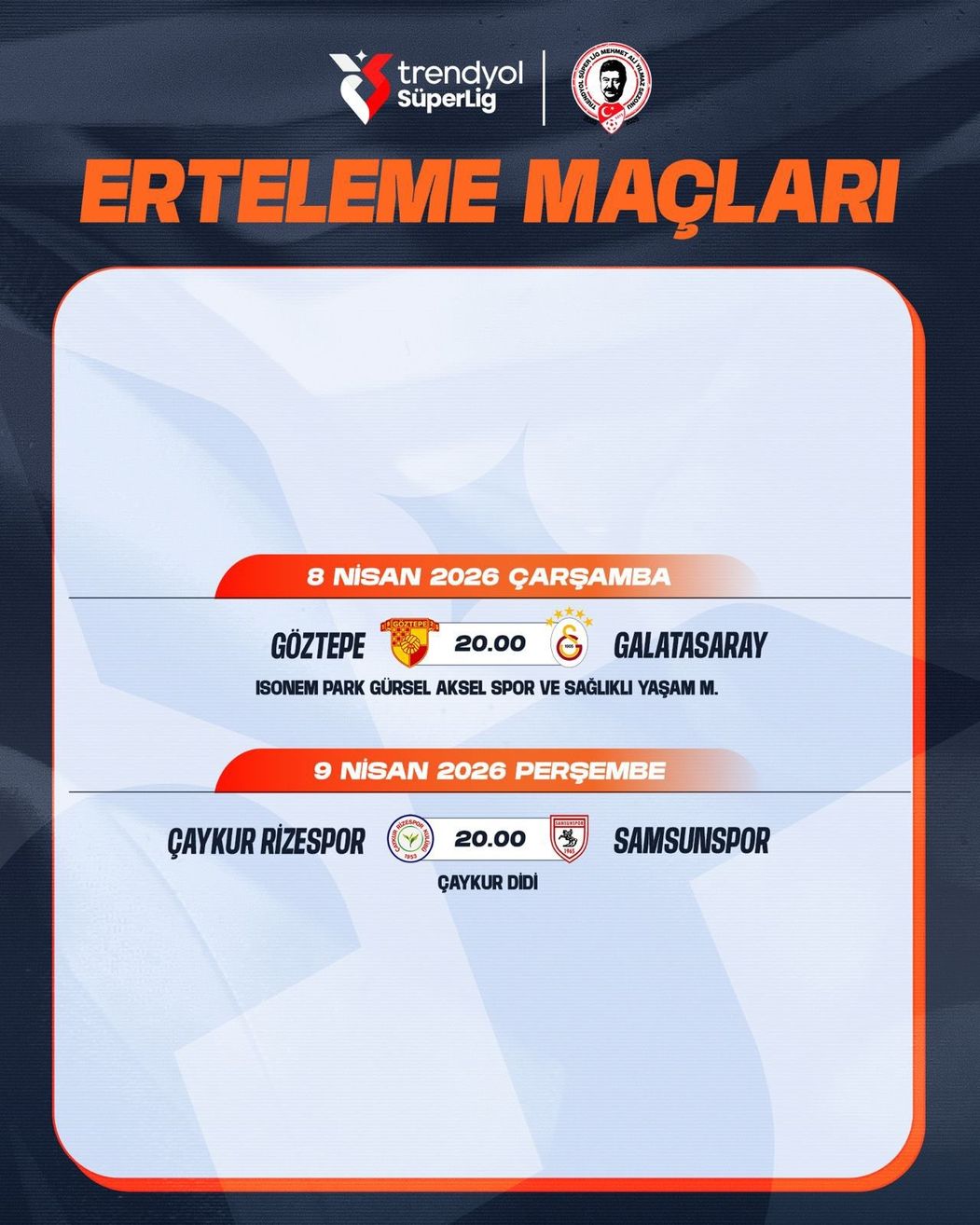 Açıklanan programa göre Göztepe-Galatasaray maçı 8 Nisan Çarşamba, Çaykur Rizespor-Samsunspor maçı ise 9 Nisan Perşembe günü oynanacak. Mücadeleler saat 20.00'de başlayacak.