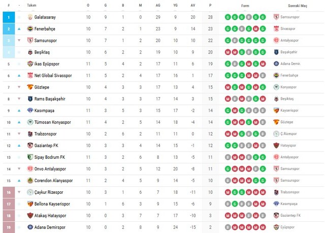 11. HAFTA SÜPER LİG PUAN DURUMU