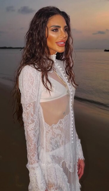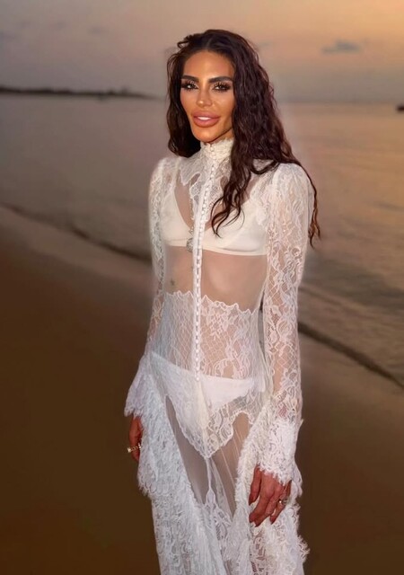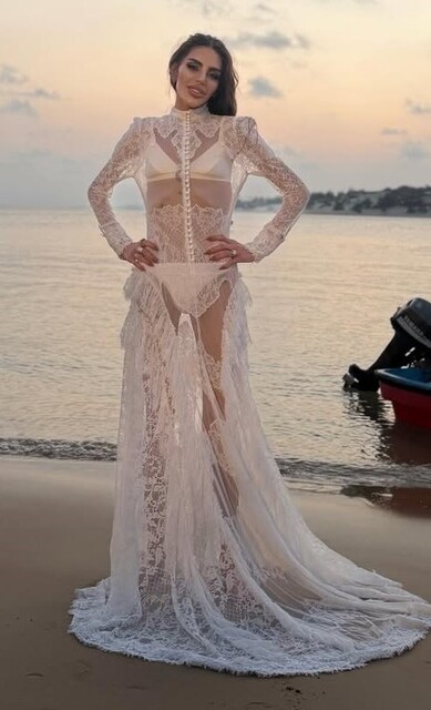 Eşi Ozan Baran ile Lamu Adası'na giden Süreyya Yalçın, dantel detayları olan beyaz transparan elbisesiyle objektife poz verdi.