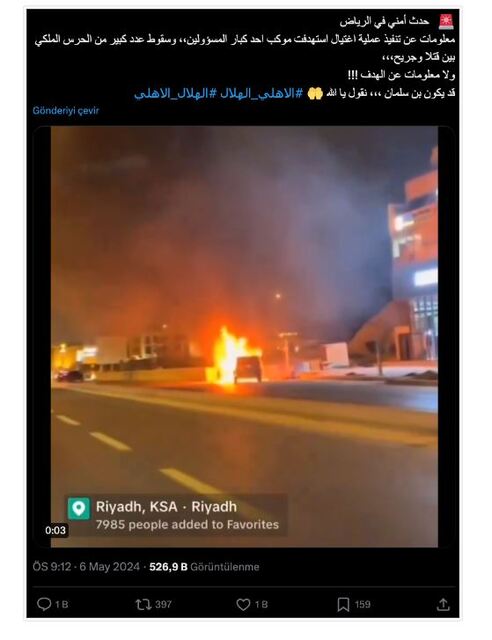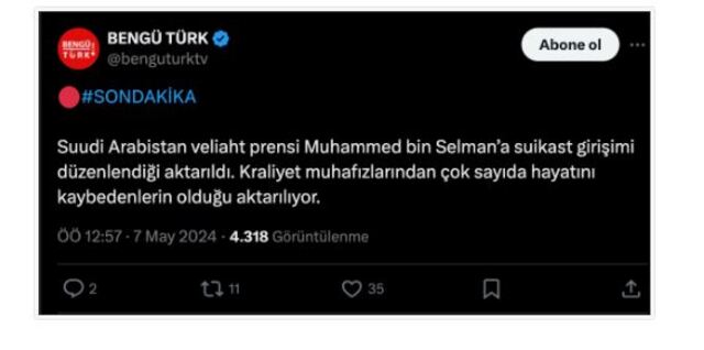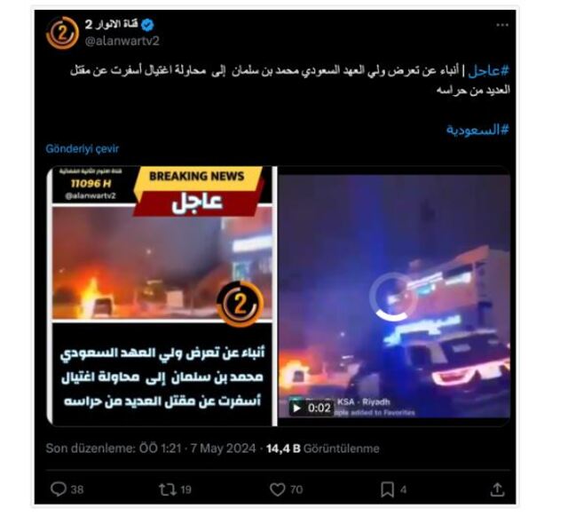 İddianın ilk önce bir X hesabı tarafından "Riyad'daki güvenlik olayı. Üst düzey bir yetkilinin konvoyunu hedef alan bir suikast operasyonu gerçekleştirildiği ve çok sayıda Kraliyet Muhafızı'nın öldürüldüğü veya yaralandığı bilgisi. Hedef hakkında bilgi yok!!! Bin Selman olabilir aman Allah diyoruz" açıklamasıyla paylaşıldığı görüldü.
