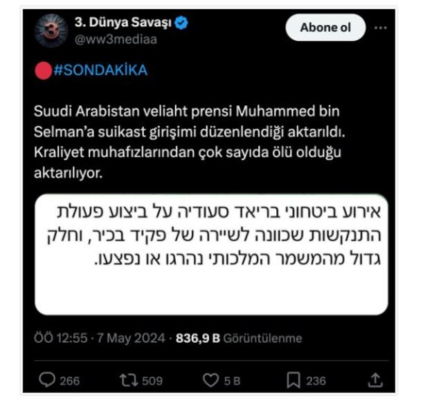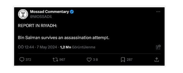 "Mossad Commentary" isimli resmi olan bir X hesabı da "Bin Salman bir suikast girişiminden sağ kurtuldu" paylaşımını yaptı.