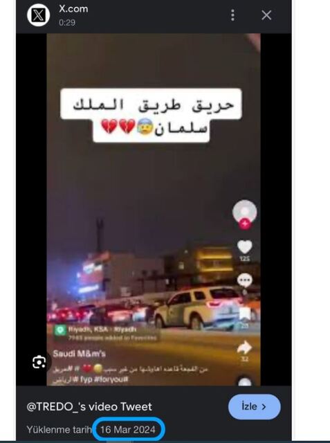 Görüntülerin, 16 Mart 2024'te Riyad'da meydana gelen trafik kazası sonucunda iki araçta çıkan yangını gösterdiği bulundu. Videonun ilk olarak Saudi M&m's isimli bir Tiktok hesabı tarafından paylaşıldığı bulundu. Ardından bir X hesabı tarafından da alıntılandığı görüldü. Ancak her iki hesabın da videoyu sildiği anlaşıldı.