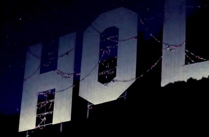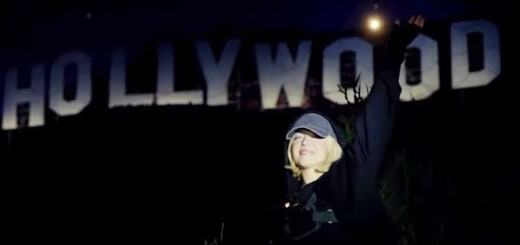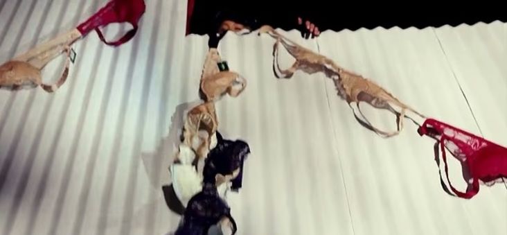 Meşalelerle aydınlatılan ortamda oyuncu, 45 metre yüksekliğindeki harflere tırmanıp sütyenleri asmadan önce "Bu hızla yakalanacağız" diyor ve iç çamaşırlarıyla kaplı tabelanın önünde gülerek poz veriyor.