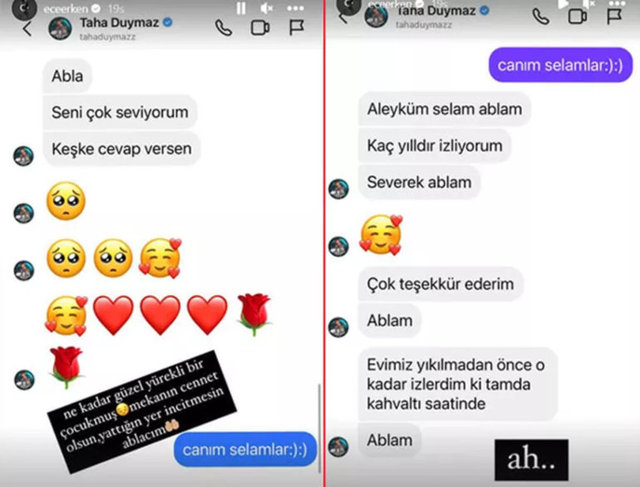 Sunucu Ece Erken de geçmişte Taha Duymaz'ın kendisine yolladığı mesajları sosyal medya sayfasına taşıdı. Erken, gönderisine, "Ne kadar güzel yürekli bir çocukmuş... Mekanın cennet olsun, yattığın yer incitmesin ablacım..." satırlarını not düştü.
