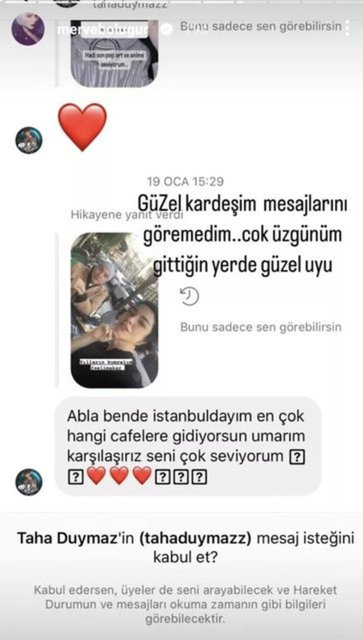 Oyuncu Merve Boluğur, kendisine bir süre önce mesaj atan ve 6 Şubat'ta meydana gelen Kahramanmaraş depreminin 12'nci gününde cansız bedenine ulaşılan Taha Duymaz'ın mesajını görmemenin üzüntüsünü dile getirdi. Boluğur, "Güzel kardeşim, mesajlarını göremedim. Çok üzgünüm, gittiği yerde güzel uyu..." dedi.