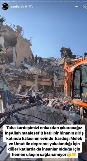CZN Burak sosyal medya hesabından son yaptığı paylaşım ile son durumu açıkladı. Taha Duymaz'ın 8 katlı bir binanın giriş zemin kardeşleri Melek ve Umut ile birlikte depreme yakalandığını açıkladı.