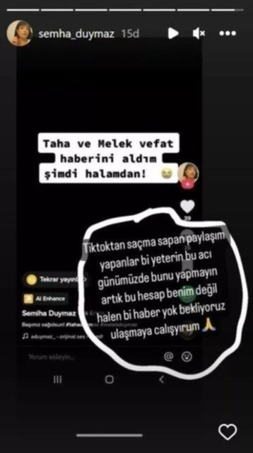 CZN Burak'ın sosyal medya hesabından yapılan paylaşımda Taha'nın ablası Semiha Durmaz; "Şu an bir umutla bekliyoruz, yalan haberlere inanmayın. Şu an böyle haberleri okuyunca ben daha çok panikliyorum, daha çok oraya gitmeye çalışıyorum işlerini engelleme engellemek istemiyorum. Lütfen artık paylaşmayın, kimsenin umudunu kırmayın." ifadelerini kullandı.