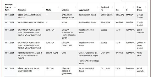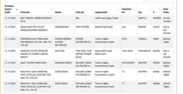 TARIM VE ORMAN BAKANLIĞI'NIN YAYIMLADIĞI LISTEDE YER ALAN BAZI ÜRÜNLER VE MARKALAR ŞU ŞEKILDE;