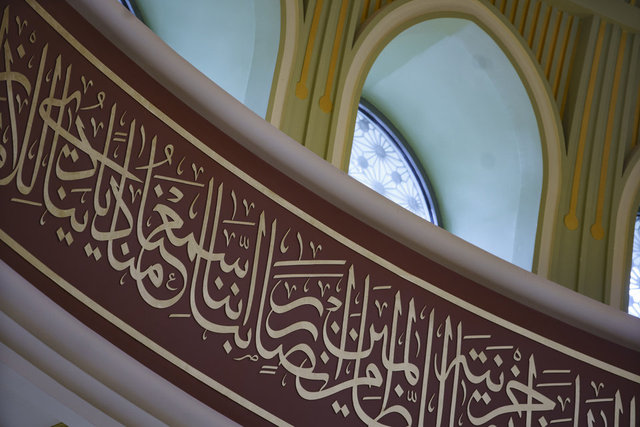 Kubbe göbek yazısında Fatiha Suresi, kubbe kasnağında Al-i İmran Suresi, orta kuşak yazısında Bakara Suresi'nin 285'inci ve 286'ncı ayetleri ile Haşr Suresi'nin 20'nci ve 24'üncü ayetleri, giriş kubbesi göbek yazısında İhlas Suresi, giriş kubbesi kasnak yazısında Ayet-el Kürsi, ana kapı üstü yazısında Nisa Suresi 103'üncü ayeti yazıldı.
