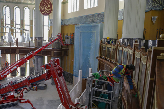 Öte yandan cami içine inşaat için kurulan iskeleler sökülüp, boyama işlemlerindeki ince işçiliğe geçildi.