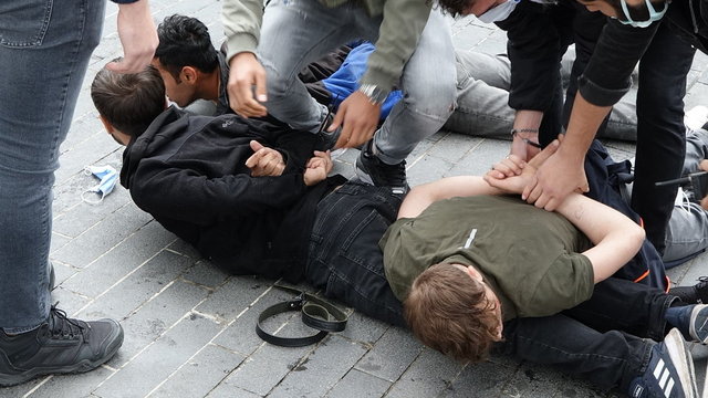 Bu sırada devreye giren Özel Harekat polislerinin de desteğiyle saldırgan 4 kişi ve 2 turist yere yatırılıp kelepçelenerek etkisiz hale getirildi.