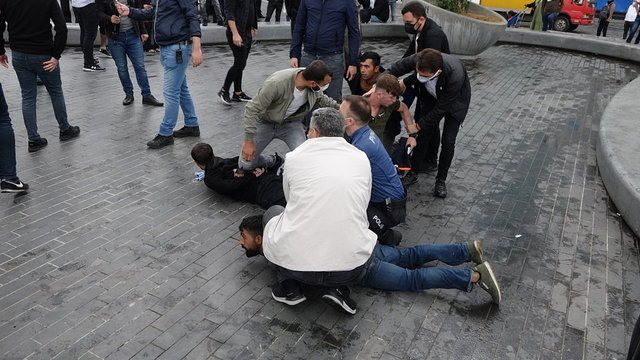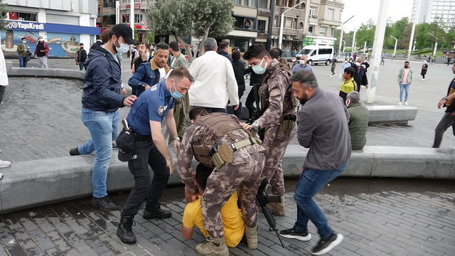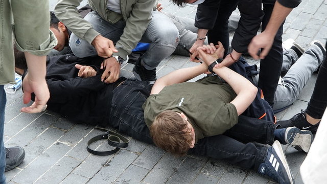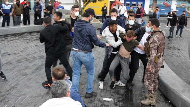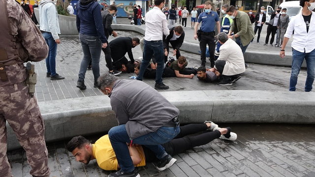 Taksim Meydanı'nda kemerlerin çıkarılıp tekme ve yumrukların havada uçuştuğu kavgayı sivil polisler ayırdı. Özel Harekat polisinin de devreye girmesiyle kavgaya karışan 2 turist ve onlara saldıran 4 kişi gözaltına alındı.