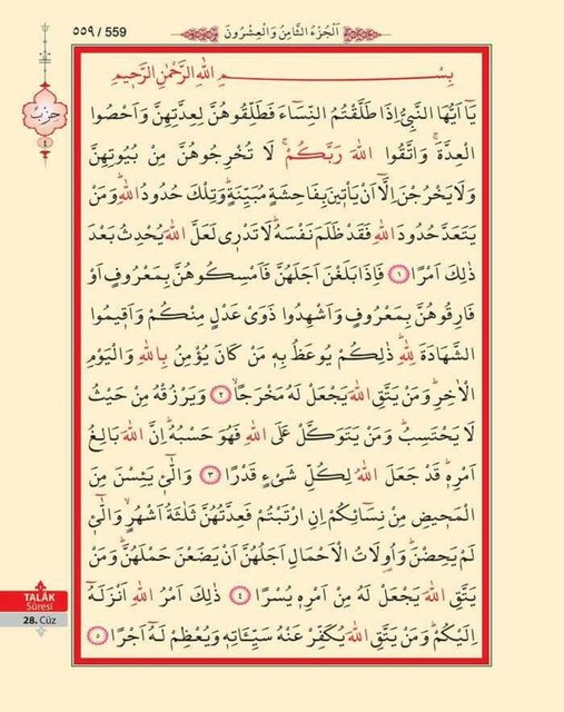 • Talak Suresi, Kur’an-ı Kerim’de 557. Sayfada başlayıp 558. Sayfada bitmektedir ve 28. Cüzde yer alır.