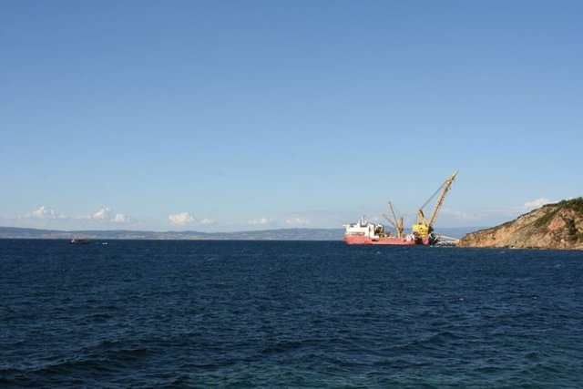 Doğalgaz borularını denizin dibine indirmek için özel donanımlı bir gemi Çanakkale'nin Biga İlçesi'ne bağlı Kemer Köyü sahiline geldi.