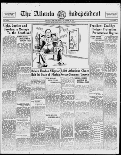 Fotoğrafta The Atlanta Independent gazetesinin 11 Ekim 1923 tarihinde olay hakkında "Florida eyaletinde bebekler timsah yemi olarak kullanıldı" başlığı attığı görülüyor.