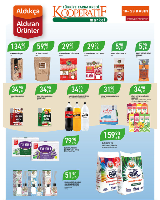 Tarım Kredi Kooperatif 16-29 Kasım aktüelini yayınladı. Kasım sonuna kadar kahve çeşitleri, içecekler, tavuk eti, salam, tarhana, yoğurt ve çeşitli gıda malzemeleri indirimli bir şekilde satılıyor. İşte, kataloğun tamamı...