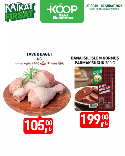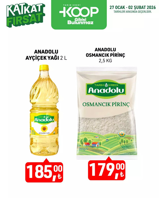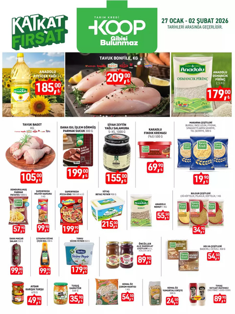 Tarım Kredi Kooperatifi Market aktüel kataloğu 27 Ocak bugün itibarıyla paylaşıldı. 2 Şubat tarihine kadar geçerli olacak indirimler ile ayçiçek yağı, tavuk bonfile, beyaz peynir, makarna çeşitleri, pirinç, siyah zeytin gibi birçok ürün satışta olacak. Her hafta özel indirimlerle dikkat çeken “Fırsat Günleri” kampanyası, alışverişseverlere avantajlı seçenekler sunuyor. Peki, 27 Ocak- 2 Şubat tarihlerinde Tarım Kredi Market’te neler indirimde? İşte kataloğun tamamı haberimizde...