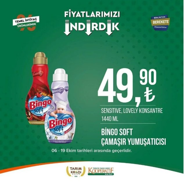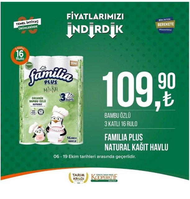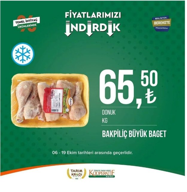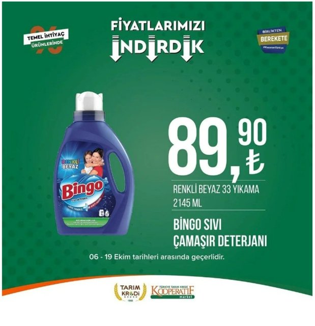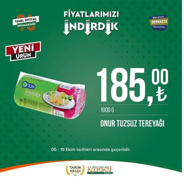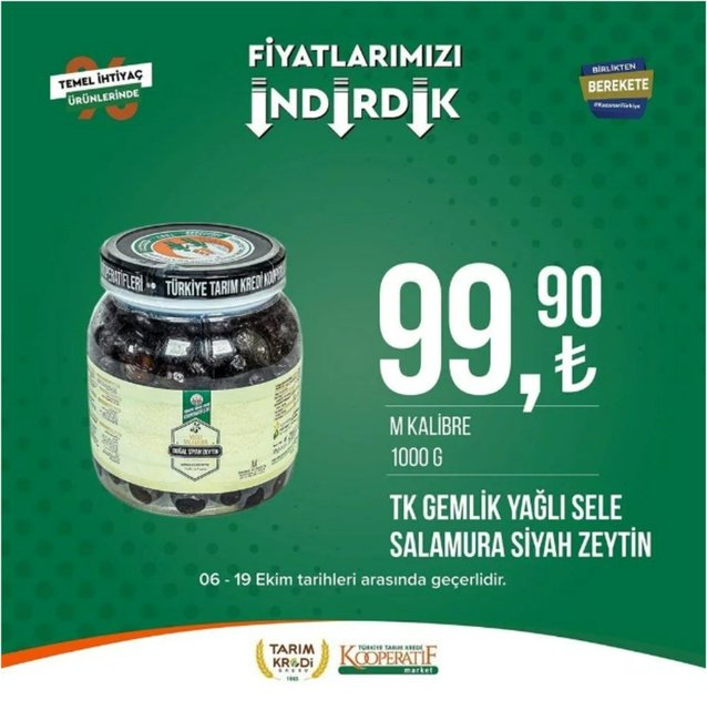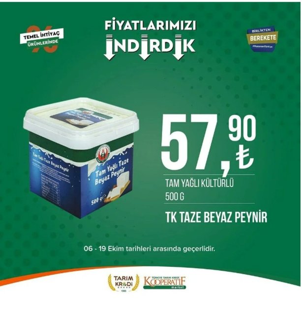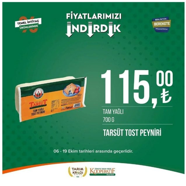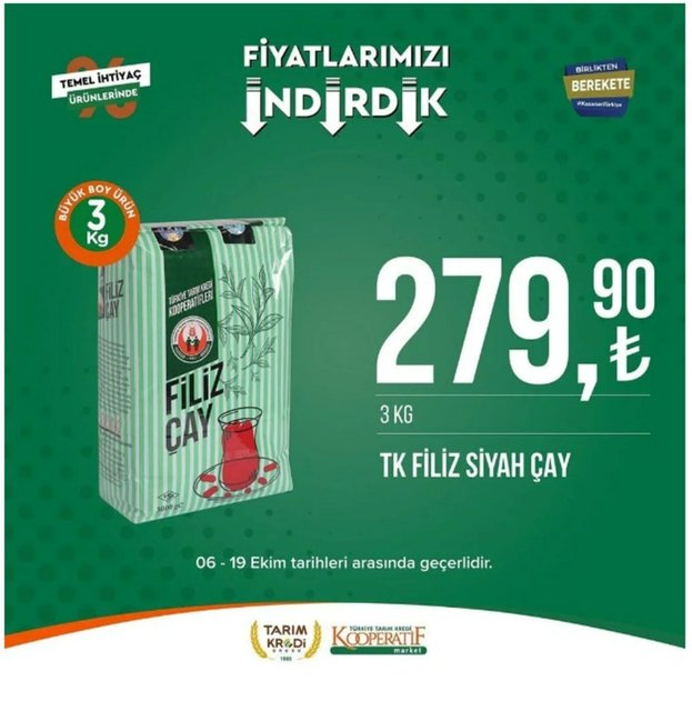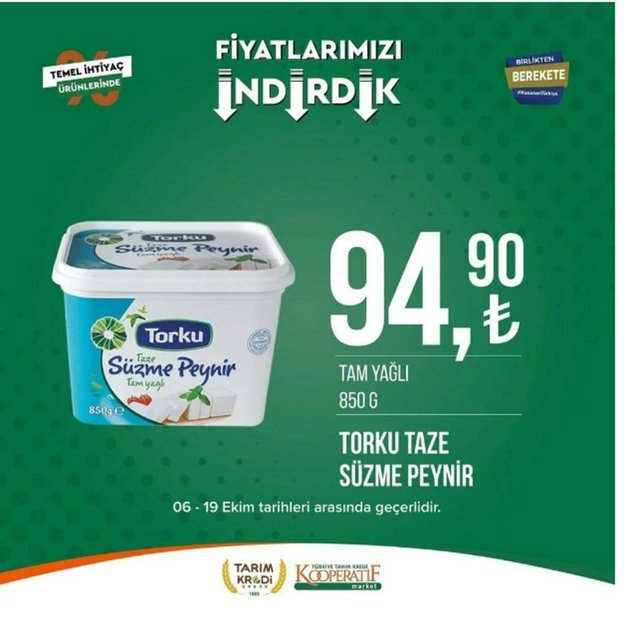 Tarım Kredi Kooperatif Market; Türkiye’nin 81 ilinde 3 bini aşkın satış noktasıyla, kaliteden ödün vermeden, sağlıklı, doğal ve katkısız ürünlerini tüketiciler ile buluşturmaktadır. Cumhurbaşkanı Recep Tayyip Erdoğan'ın zincir marketlere yönelik yaptığı indirim çağrısının ardından Tarım Kredi Kooperatif Marketlerde mevcut indirim kampanyalarına ilave olarak 16 Ekim'de başlayacak yeni kampanya kapsamında, süt, peynir, pirinç, nohut, mercimek, ayçiçeği yağı, salça, çay, un gibi temel ihtiyaç ürünleri ile deterjan, sabun, kağıt peçete ve kağıt havlu gibi temizlik ürünlerinde yüzde 50'ye varan indirim yapılacak.