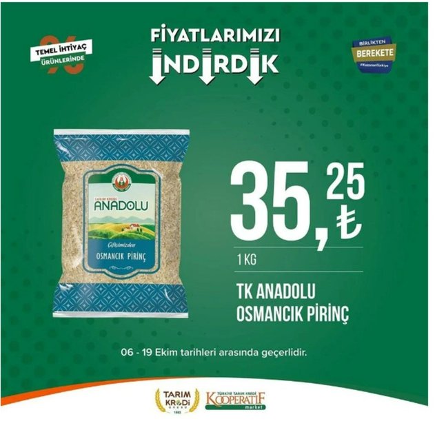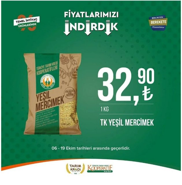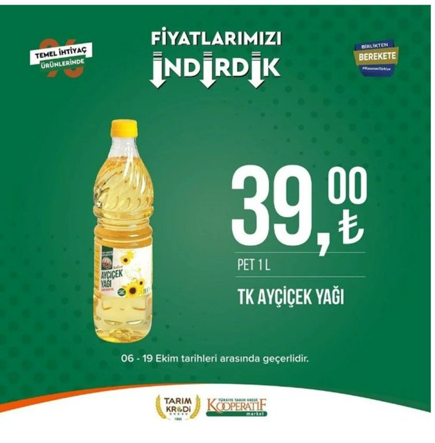 Türkiye'nin 81 ilinde 3 bini aşkın satış noktası bulunan Tarım Kredi Market 16 Ekim itibarıyla süt, peynir, pirinç, nohut, mercimek, ayçiçeği yağı, salça, çay, un gibi temel ihtiyaç ürünleri ile deterjan, sabun, kağıt peçete ve kağıt havlu gibi temizlik ürünlerinde yüzde 50'ye varan indirim uygulayacak. 12-19 Ekim günleri arasında indirime girecek olan ürünler ise yayınlandı. İşte Tarım Kredi Market indirimli ürünler kataloğu...