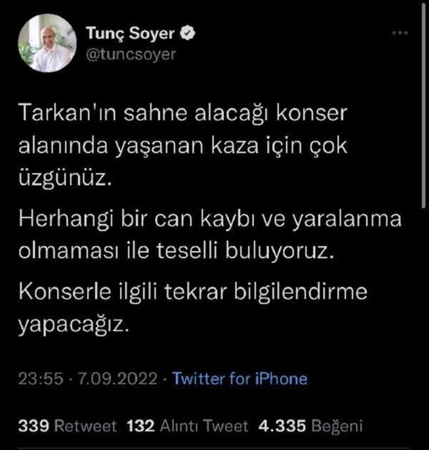 Yaşanaların ardından İzmir Büyükşehir Belediye Başkanı Tunç Soyer, "Tarkan'ın sahne alacağı konser alanında yaşanan kaza için çok üzgünüz. Herhangi bir can kaybı ve yaralanma olmaması ile teselli buluyoruz. Konserle ilgili tekrar bilgilendirme yapacağız" demişti.