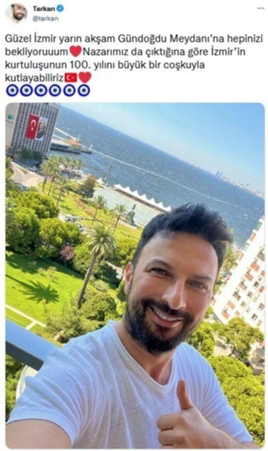 Ünlü şarkıcı, ardından, "Güzel İzmir, Gündoğdu Meydanı’na hepinizi bekliyorum. Nazarımız da çıktığına göre İzmir’in kurtuluşunun 100. yılını büyük bir coşkuyla kutlayabiliriz" ifadelerini kullanmıştı.