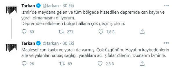 48 yaşındaki Tarkan, İzmir depremi sonrası, "İzmir'de meydana gelen ve tüm bölgede hissedilen depremde can kaybı ve yaralı olmamasını diliyorum. Depremden etkilenen bölge halkına çok geçmiş olsun" ifadelerini kullanmıştı.