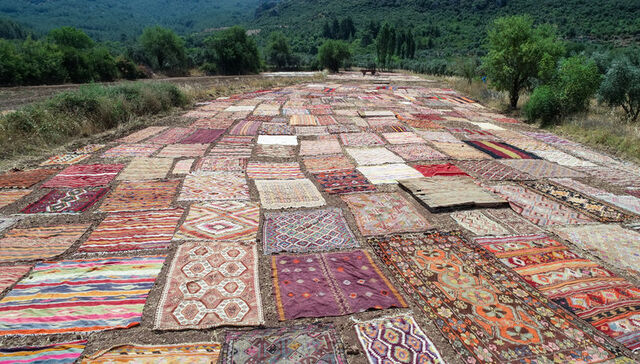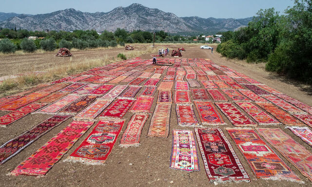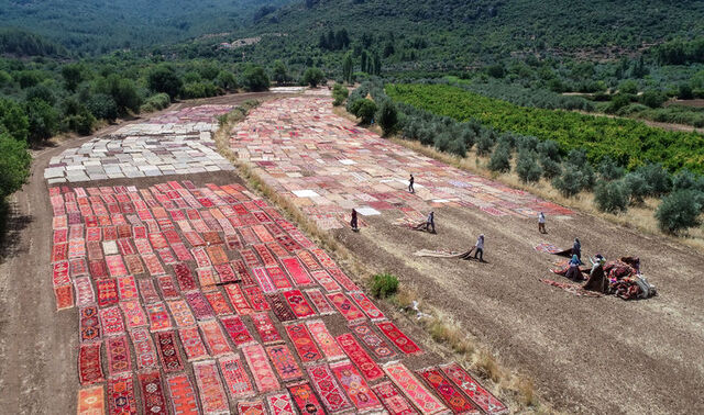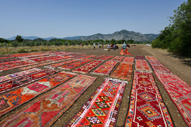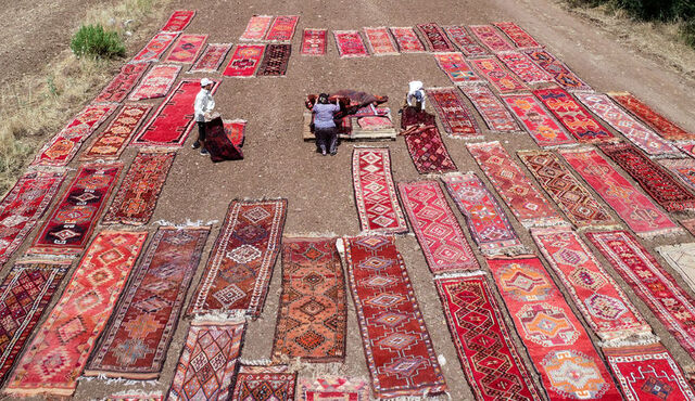Her gün bu işlemi özenle yapan işçiler, rüzgar nedeniyle sürekli toz olan zorlu arazi şartlarında yoğun çalışma yürütüyor. Kadınların binbir emekle renklerinin pastelleşmesini sağladığı halılar, eylülden itibaren toplanıyor ve yurt dışındaki satış bölgelerine gönderiliyor.