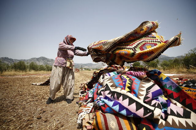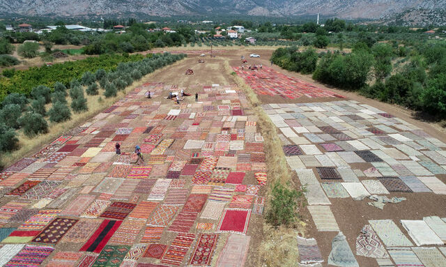 Antalya'da tarlalara serilen binlerce el dokuması halı ve kilimin pastelleşme sürecine kadarki işlerin çoğu kadın işçiler tarafından yürütülüyor