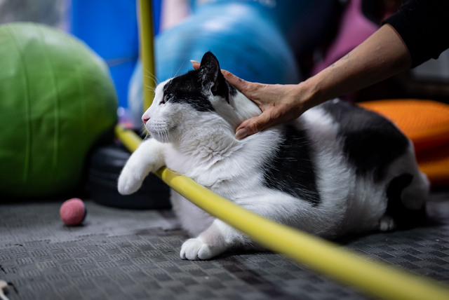 Veteriner Teknikeri ve Fizyoterapisti Yağmur Denli'nin gözetiminde çalışan 11,5 kiloluk obez kedi Boncuk, koşu bandında yürüyor, pilates yapıyor, denge ve engel parkurlarında fazla kilolarından kurtulmaya çalışıyor.