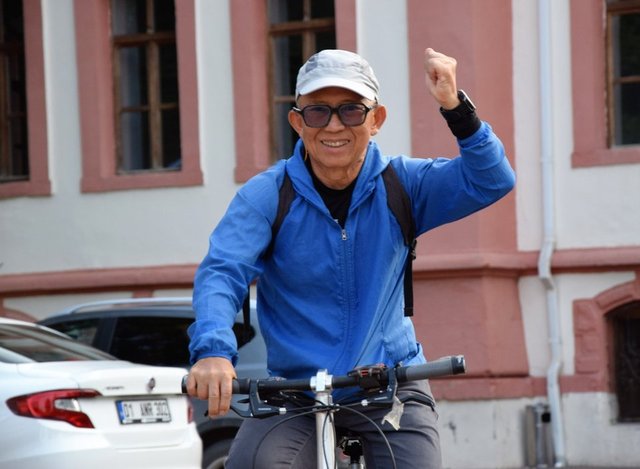 Katlanabilir bisikletleri olmasından dolayı sıcak günlerde günlerde yolun bir bölümünü otobüsle kateden dayı ve yeğen, Bisikletliler Derneği Bilecik Temsilcisi Hakan Yavuz tarafından karşılandıkları kentte tarihi mekanları dolaştı.