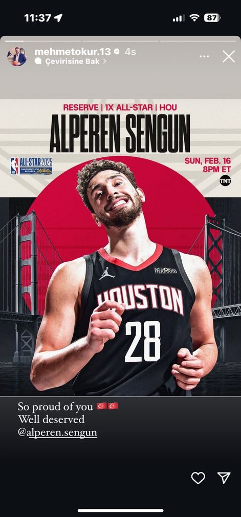 "Milli oyuncumuz Alperen Şengün, NBA All-Star 2025’te forma giyecek! A Erkek Milli Takımımız’ın ve Houston Rockets’ın değerli oyuncusu Alperen Şengün, Batı Konferansı’ndan seçilerek #NBAAllStar 2025’te boy göstermeye hak kazandı. Tebrikler Alperen."