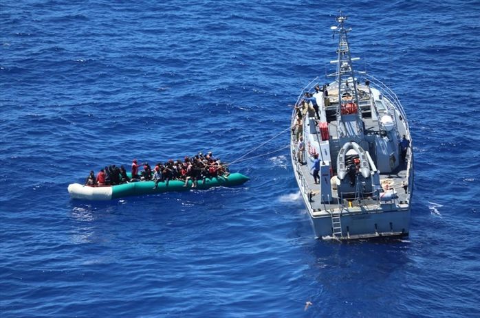 Libya açıklarında göre yapan TCG Gaziantep fırkateyni, Khoms Limanı açıklarında batmak üzerine olduğu tespit edilen lastik bottaki 97 göçmeni kurtardı.