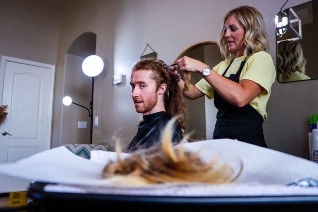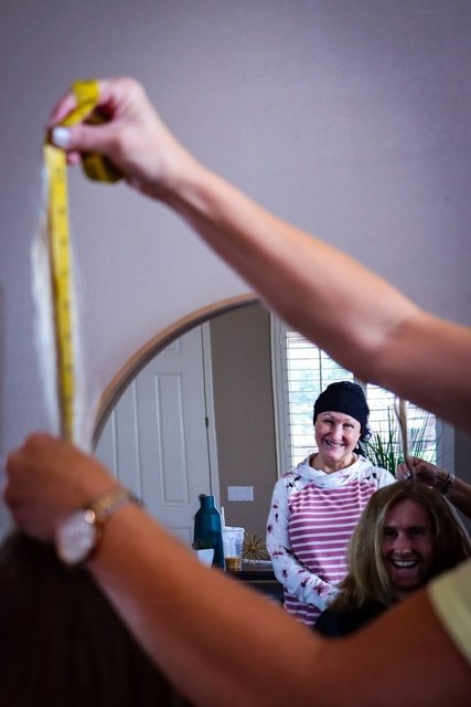 Saçları yeterli uzunluğa ulaştığında Matt, birkaç iş arkadaşıyla birlikte annesinin evine gitti. Orada, Matt'in tüm saçlarını kestiler.